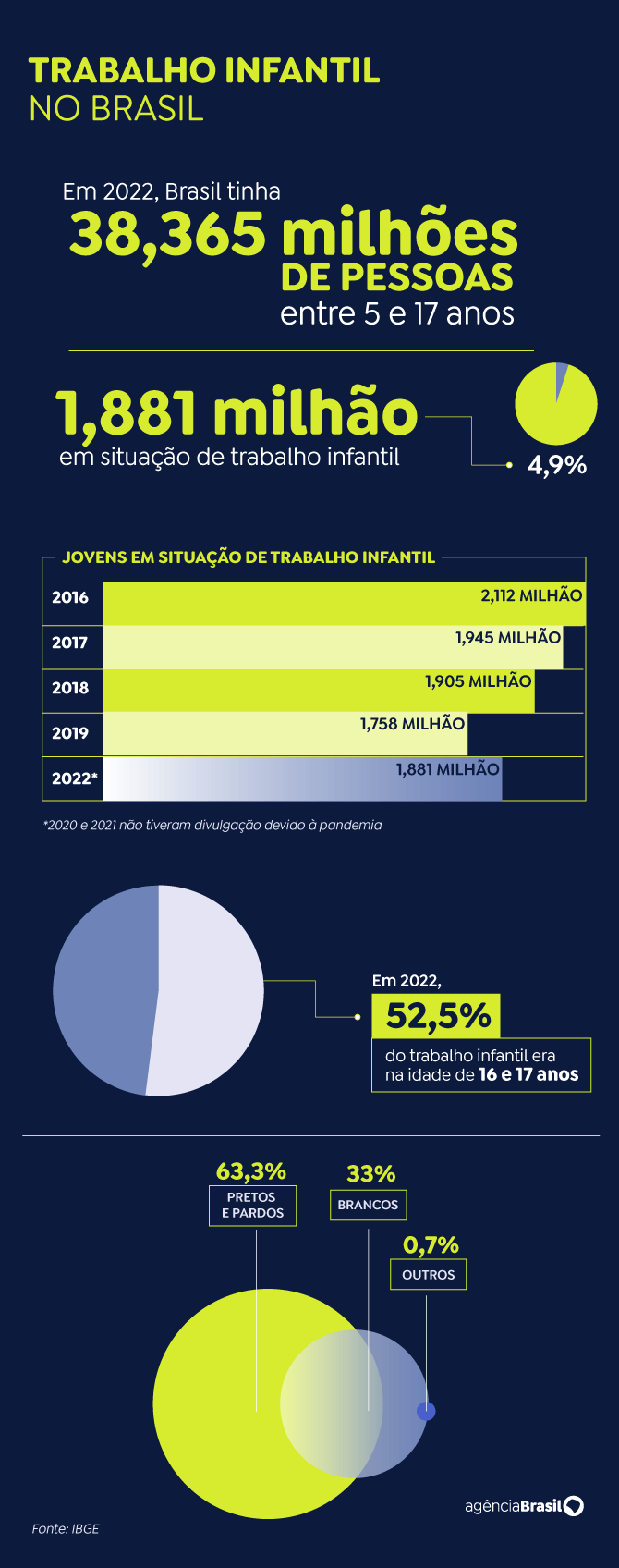 O IBGE estima que, no país, 2,1 milhões de pessoas entre 5 e 17 anos exerciam atividades econômicas ou para autoconsumo em 2022. A diferença desse número para o universo de jovens classificados como em situação de trabalho infantil (1,881 milhão) se dá porque nem todas as atividades nessa faixa etária são consideradas trabalho infantil.