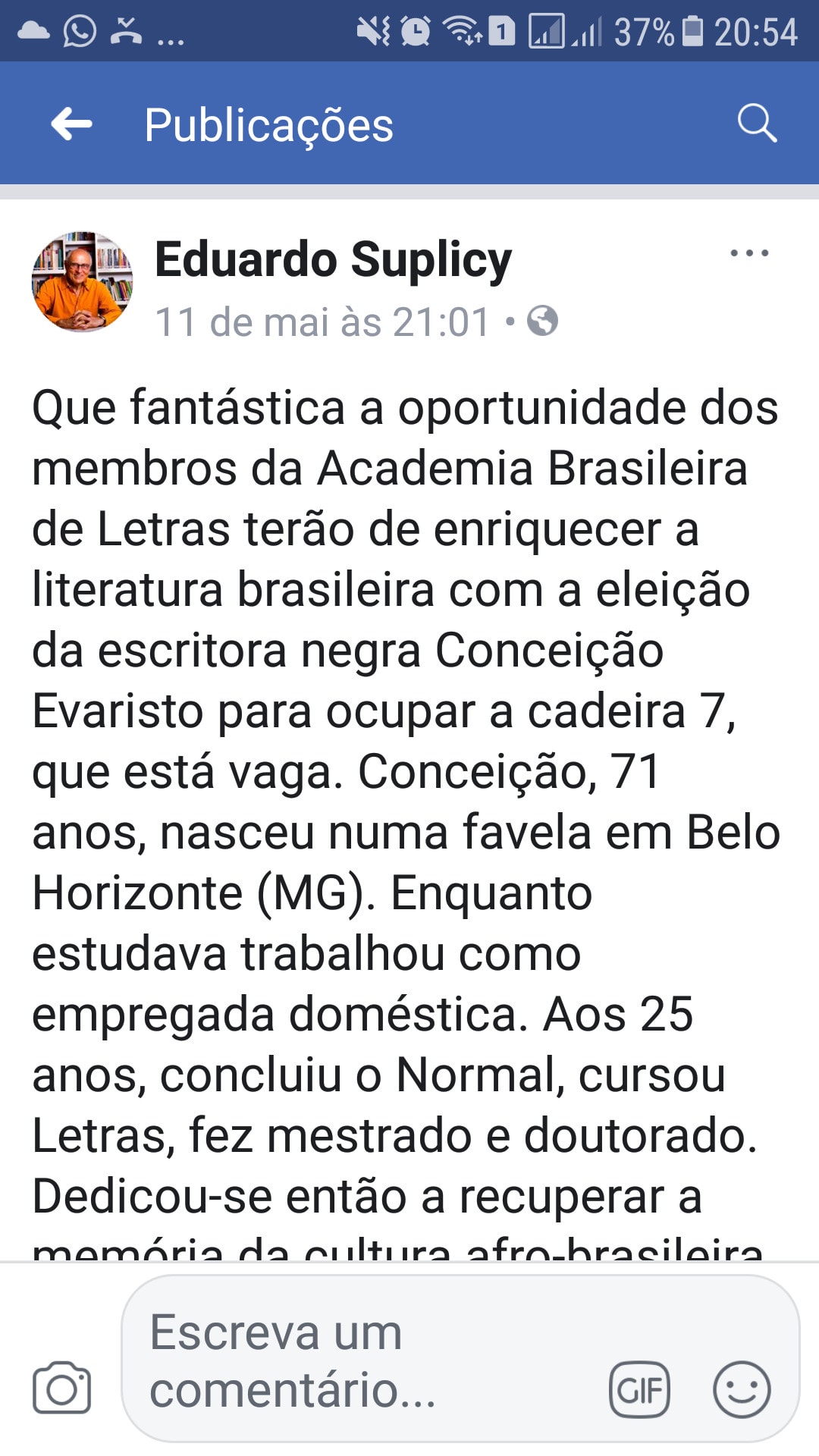Nas redes sociais, diversas personalidades tem se manifestado em favor da escolha de Conceição para ocupar a cedeira cujo o patrono é Castro Alves. “Que fantástica a oportunidade dos membros da Academia Brasileira de Letras terão de enriquecer a literatura brasileira com a eleição da escritora negra Conceição Evaristo para ocupar a cadeira 7, que está vaga”, disse o ex-senador e atual vereador de São Paulo, Eduardo Suplicy na sua conta no Facebook.