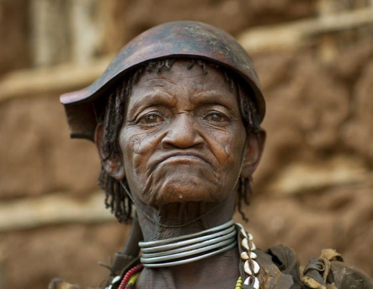 Jovem da tribo Surma, Etiópia. Uma jovem da tribo Surma é considerada formosa se tiver um grande disco nos lábios e se seu corpo estiver coberto de escarificações que são feitas com espinhos de acácia e às vezes com lâminas de barbear. A deformação dos lábios são uma parte importante da cultura Surma. O tamanho dos discos nos lábios das mulheres determina a quantidade de gado que as jovens receberão como dote ao se casar. Às vezes o lábio rompe-se pela pressão e este é um grande problema para a jovem, porque os homens consideram-no muito feio, e ela que não conseguirá se casar com ninguém da tribo, a não ser com idosos ou com pessoas doentes.