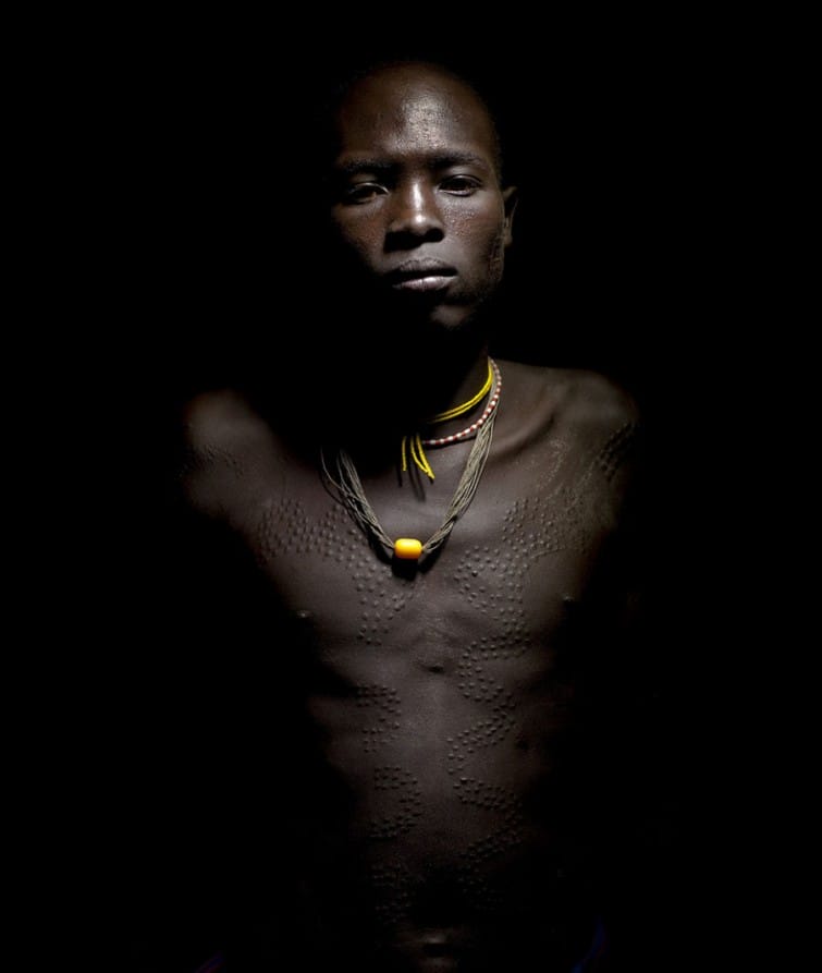 Guerreiro Surma com escarificações por todo o corpo, Etiópia. Os homens, assim como as mulheres, da tribo Surma também fazem escarificações por todo o corpo. Se é um sinal de beleza para as mulheres, para os homens é uma representação das lutas que realizou.