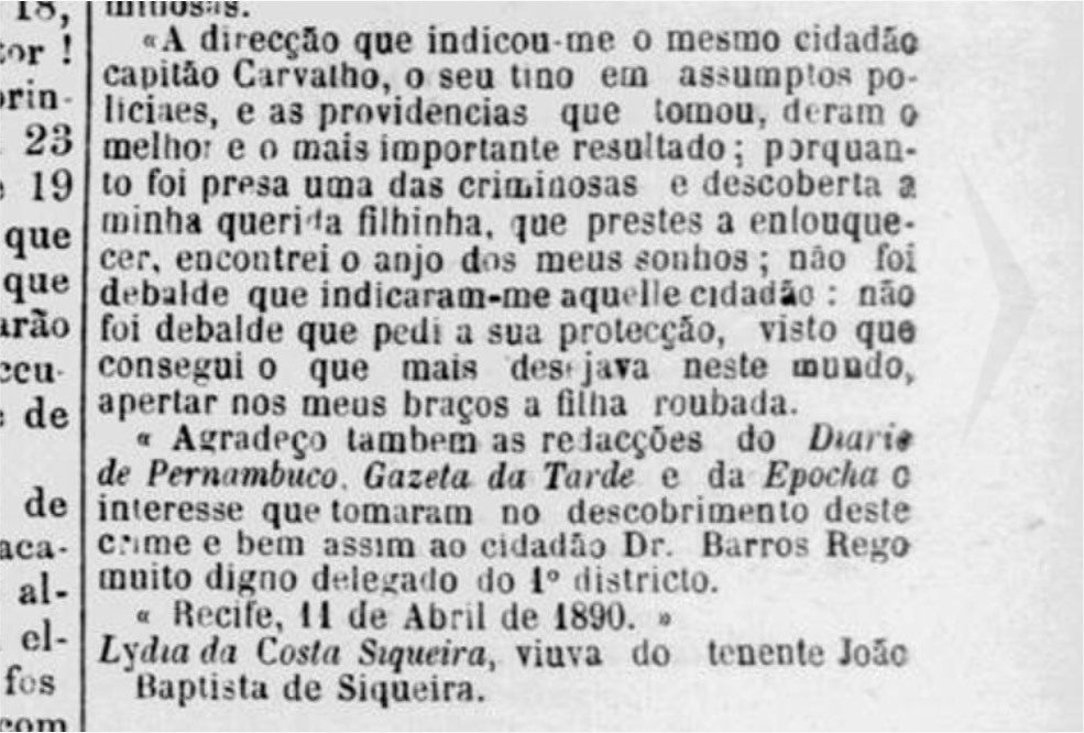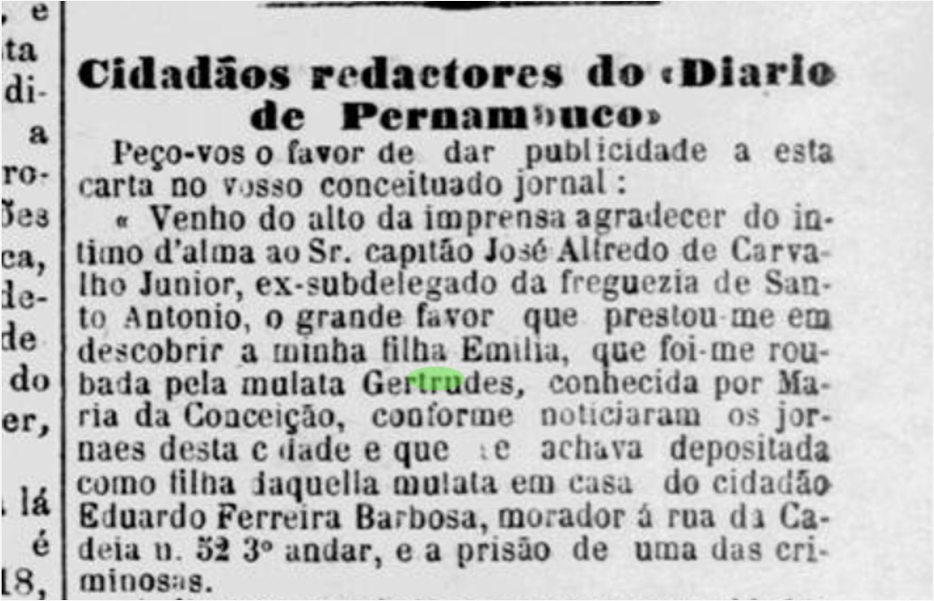 No habeas corpus aberto em 1890 na cidade do Recife, encontramos a história de Gertrudes Rosario Maria da Conceição, acusada da faina de “pegar crianças”. Gertrudes era uma criada doméstica de 21 anos, ex-escravizada, analfabeta, solteira, africana – pela idade importada ilegalmente para o Brasil – e mãe de Olindina, alvo do litígio.