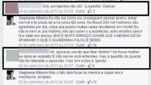 O que posso deixar claro é que dessas pessoas, eu resolvi me afastar foi um processo complicado, porque era gente que eu via como amigo, mas acho que não posso ser próxima de quem acha que é piada racismo. Além do mais, ouve uma briga na faculdade, onde um namorado de uma aluna, invadiu o local e agrediu um aluno. Diante desse fato, um dos seguranças de PUC, se manifestou com a seguinte frase “Quem devia ter apanhado era essa menina.” O fato é que independente do porquê da briga, independente de quem fez algo ou não, agressão é intolerável a agressão a mulher num país com números como o nosso, e isso não devia nem ter sido cogitado por quem devia zelar pela nossa segurança. Quando eu manifestei minha opinião sobre a fala do tal segurança. Meu Facebook foi novamente invadido pelos alunos da Faculdade de Arquitetura da Pontifícia Universidade Católica, dessa vez defendendo agressão a mulher. Sim, eles defenderam que dependendo da justificativa uma mulher poderia ser agredida.
