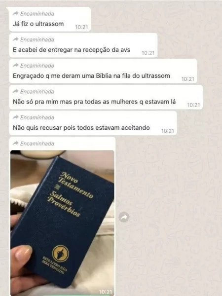 A Universa, Juliana conta que estava monitorando, virtualmente, o atendimento da universitária na unidade, quando ela escreveu para Juliana, via mensagem de texto: “Engraçado que me deram uma Bíblia na fila do ultrassom. Não só para mim mas para todas as mulheres que estavam lá. Não quis recusar pois todos estavam aceitando.”